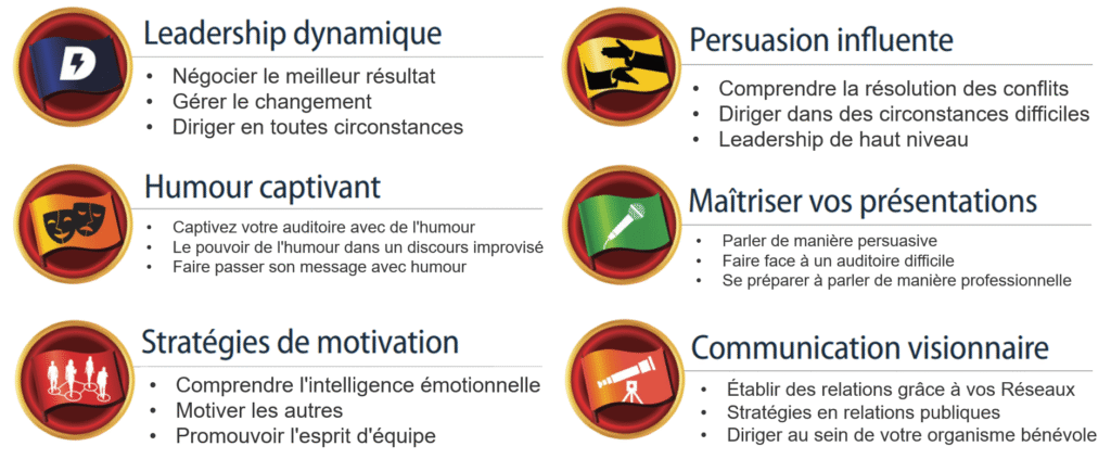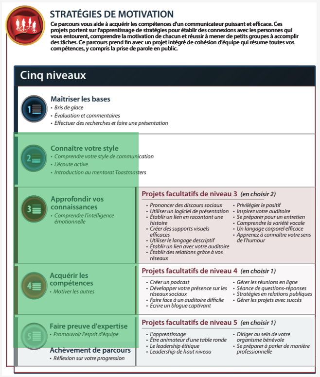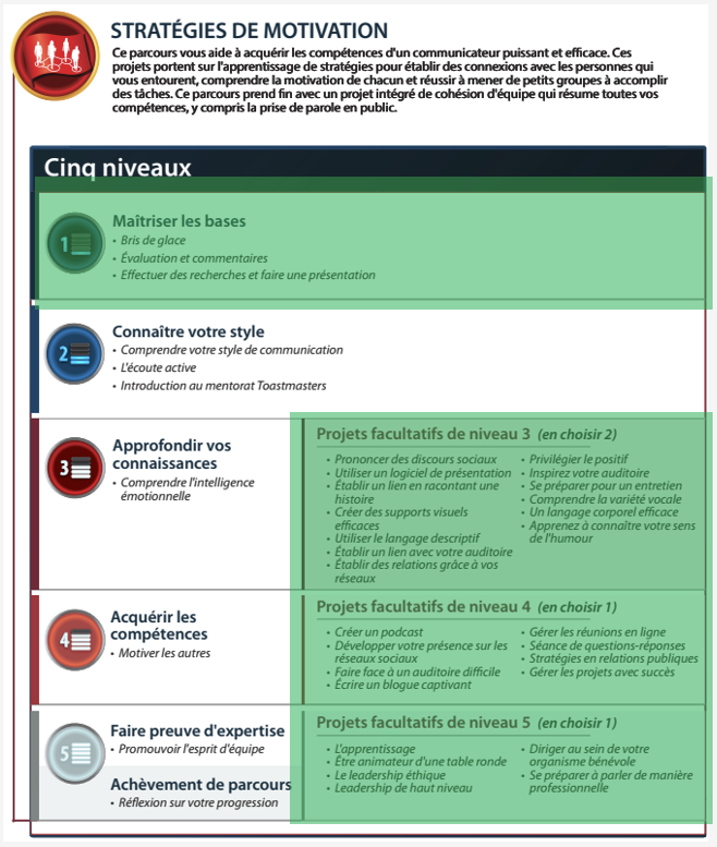 Au début du parcours de formation Toastmasters, chaque membre est amené a choisir son parcours Pathways parmi 6 choix possible: